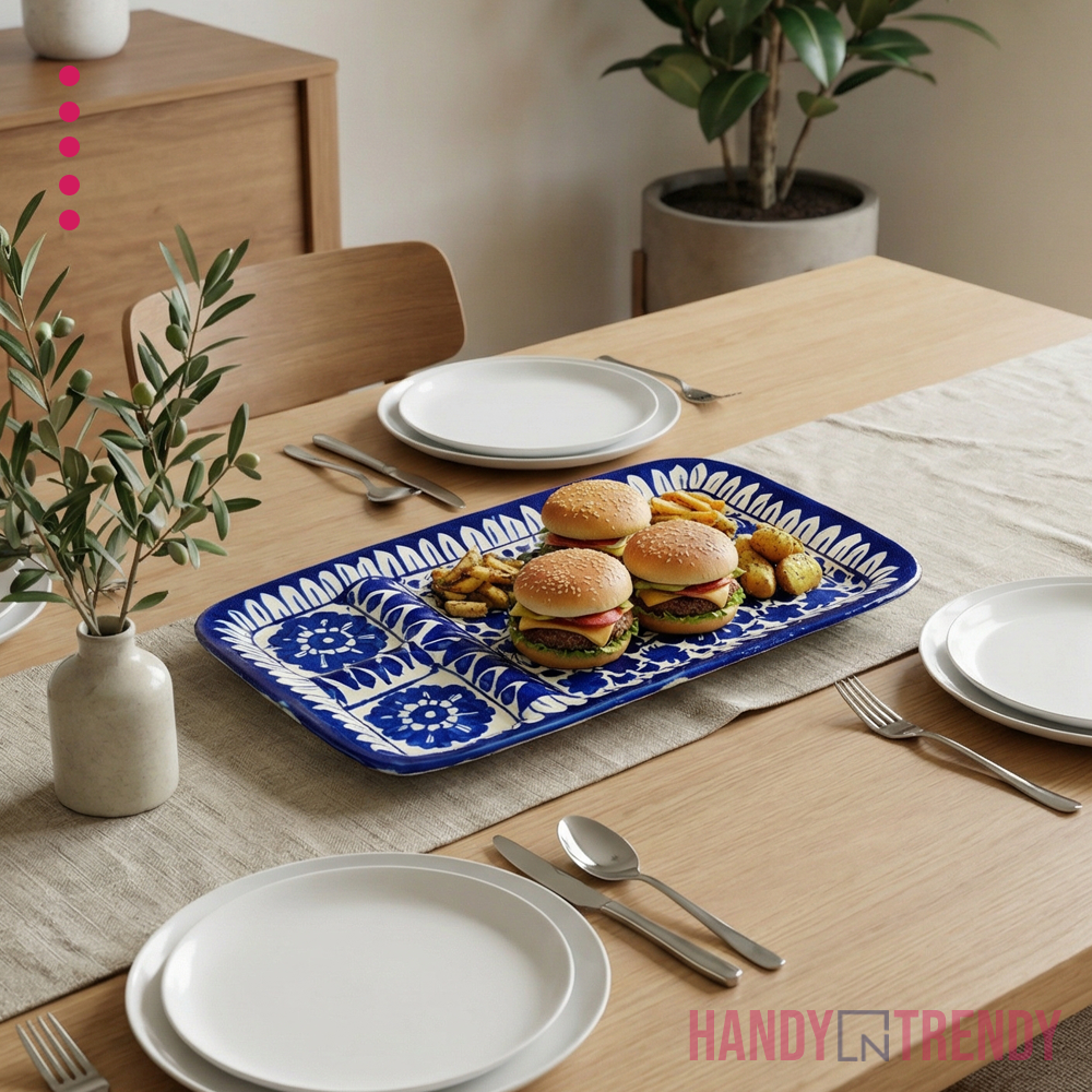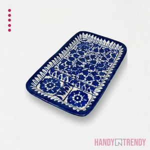 This Handmade Ceramic Snack Serving Dish features a beautifully crafted blue floral design with three distinct compartments—perfect for serving dry fruits, chutneys, sauces, or bite-sized appetizers. The rectangular layout includes two square sections and one elongated tray, allowing for elegant plating and portion control. Made with care and precision, its intricate artwork and glazed finish make it ideal for festive tables, tea-time hosting, or everyday indulgence.