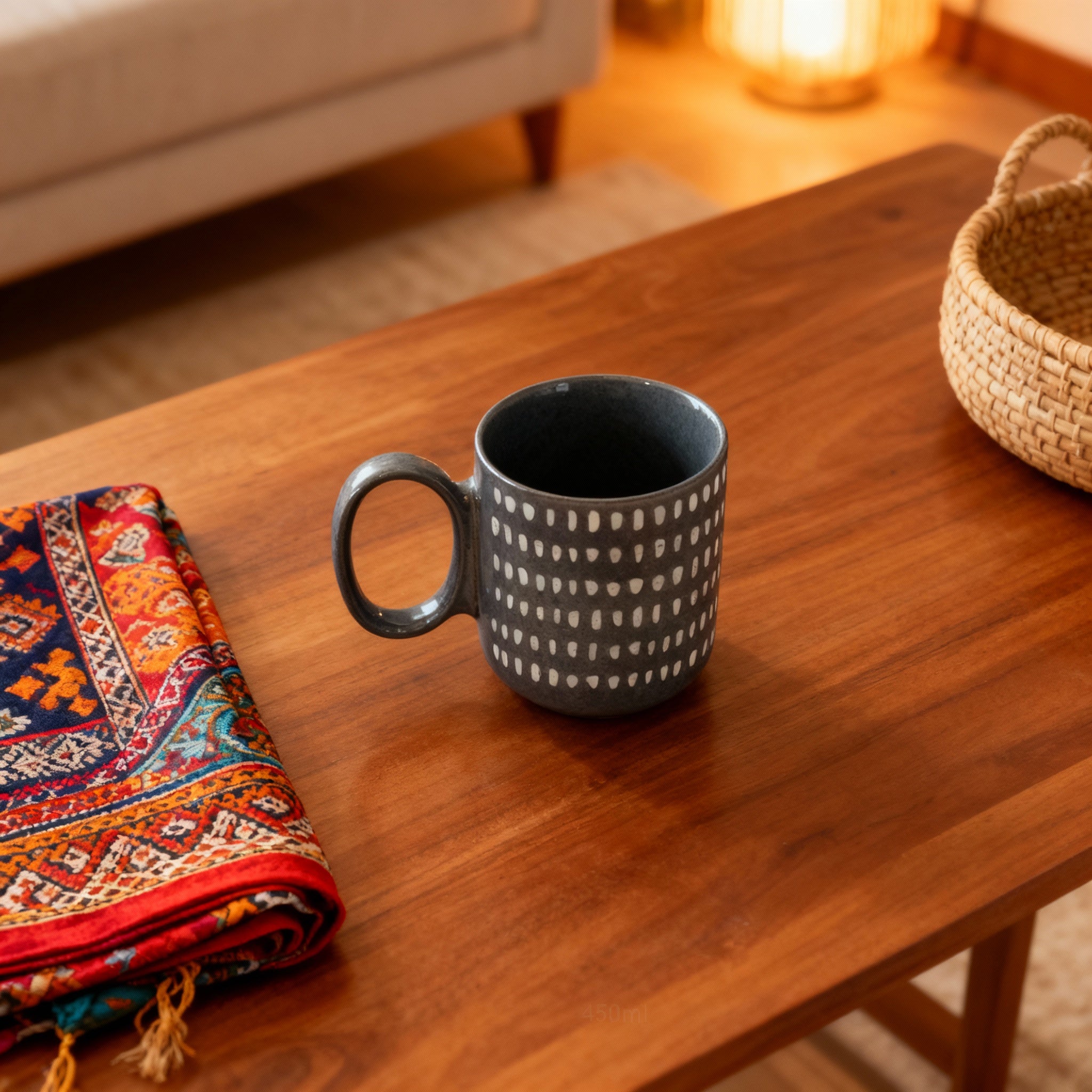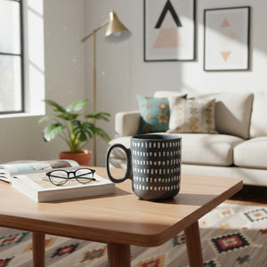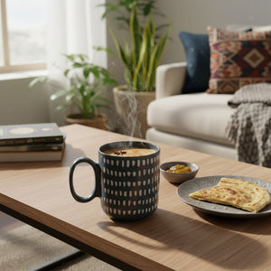 The Dusk Drop Mug is designed for those who appreciate clean lines and subtle detail. Featuring a charcoal base with evenly spaced white oval motifs, this 330ml ceramic cup brings contemporary elegance to your coffee or tea ritual. Its durable ceramic build retains heat, while the ergonomic handle ensures comfort with every sip. Perfect for daily use, gifting, or adding a stylish accent to your kitchenware collection.