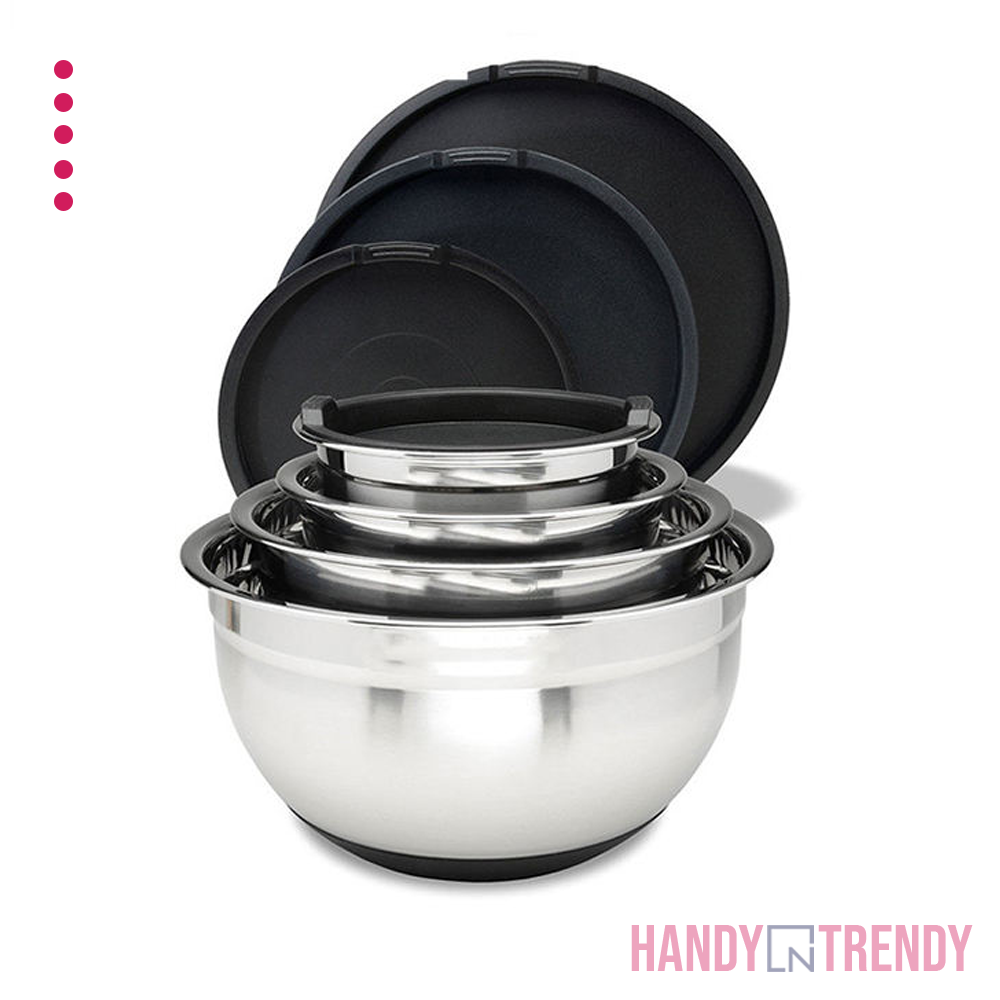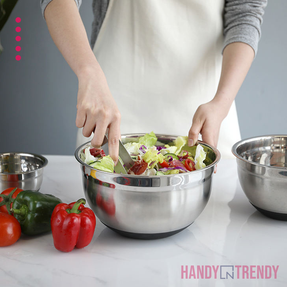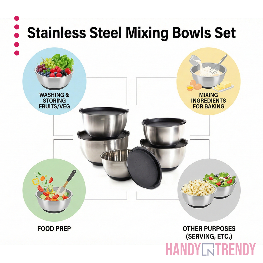This 10-piece Stainless Steel Mixing Bowls Set includes five nesting bowls with matching airtight lids, designed for every stage of your kitchen workflow. Whether you’re mixing batter, tossing salads, marinating meats, or storing leftovers, these bowls deliver unmatched convenience. Made from food-grade stainless steel, they’re rust-resistant, odor-free, and built to last. The sleek design and stackable format save space while keeping your kitchen organized.
