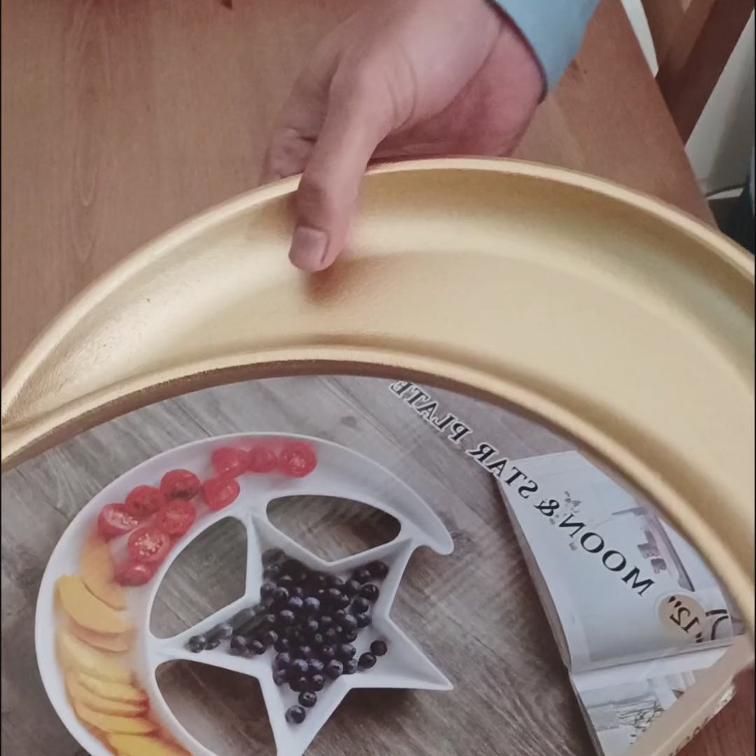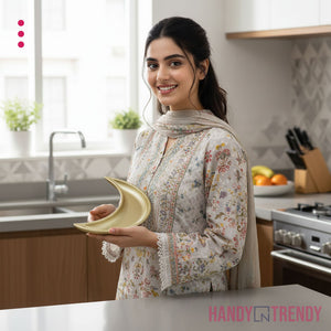 Its unique crescent-inspired design makes it an ideal choice for Ramzan iftar spreads, Eid gatherings, dinner parties, and everyday table décor. Whether you are hosting guests or styling your dining table, this wooden platter adds a premium, natural aesthetic that complements both traditional and contemporary tableware.
