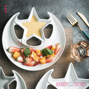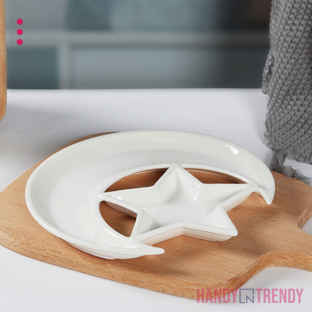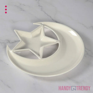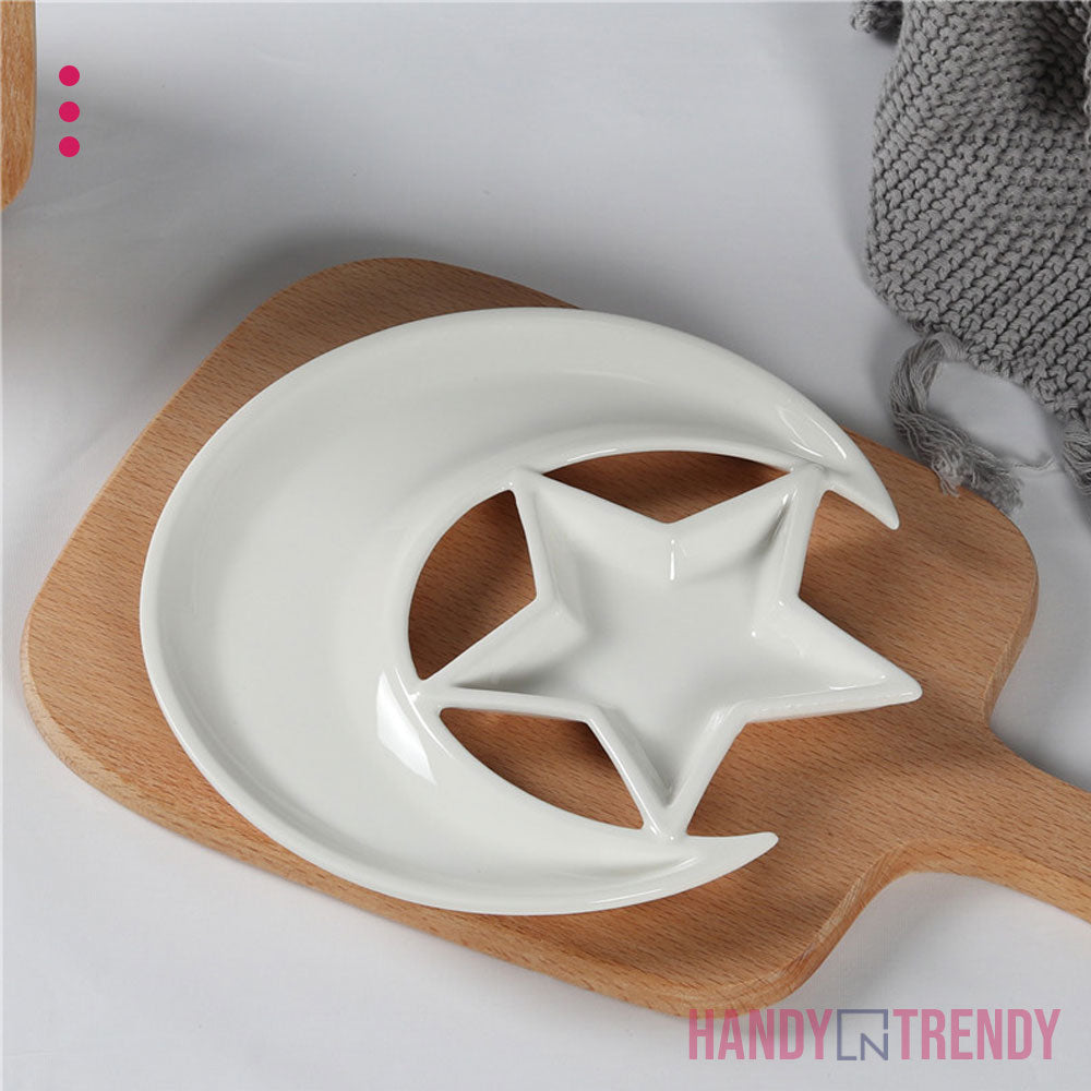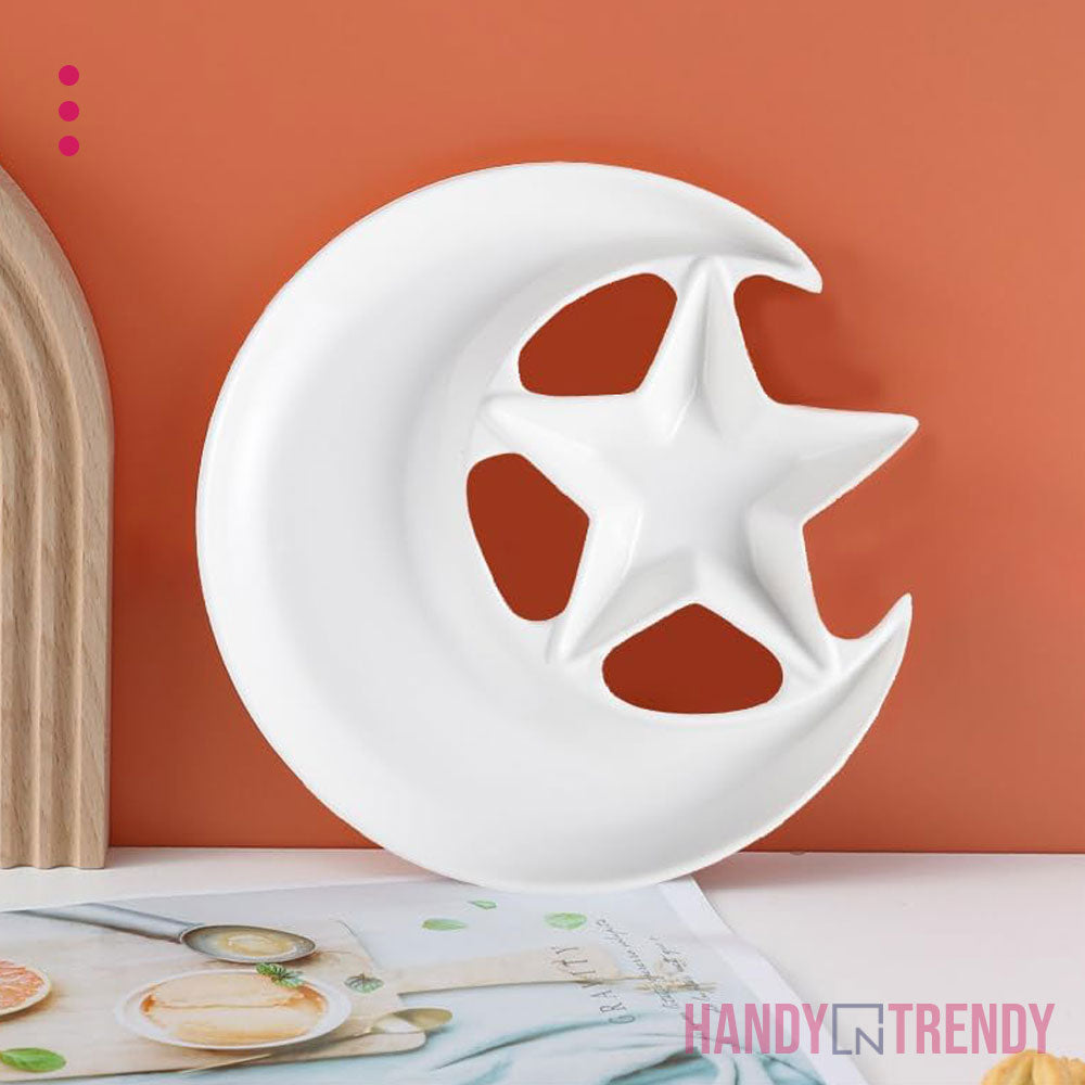 The Moon & Star Ceramic Plate is a uniquely designed serving dish that brings elegance and creativity to your table. Shaped like a crescent moon with a star-shaped dip section, it’s perfect for presenting fruits, dry snacks, desserts, or sauces in a visually delightful way. Made from high-quality ceramic, it’s both durable and food-safe, ideal for themed dinners, festive gatherings, or everyday plating that feels special. Whether you're hosting guests or curating a cozy meal, this plate adds a magical touch to your kitchenware collection.