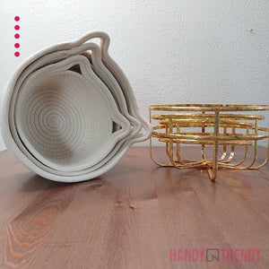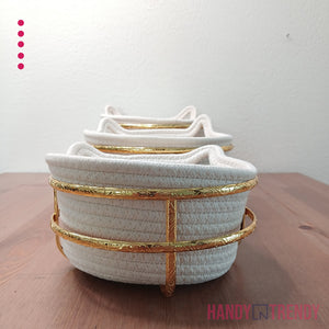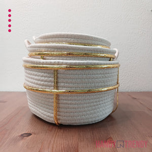 Add a touch of natural elegance to your home with this set of handwoven cotton rope baskets, perfect for both serving and storage. Featuring a clean white base with gold-accented bands, these baskets blend functionality with modern aesthetics. Whether you're organizing fruits, bread, snacks, or household essentials, their versatile design makes them ideal for kitchens, dining tables, or open shelving.
