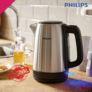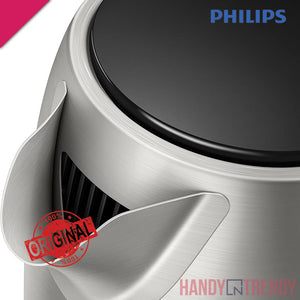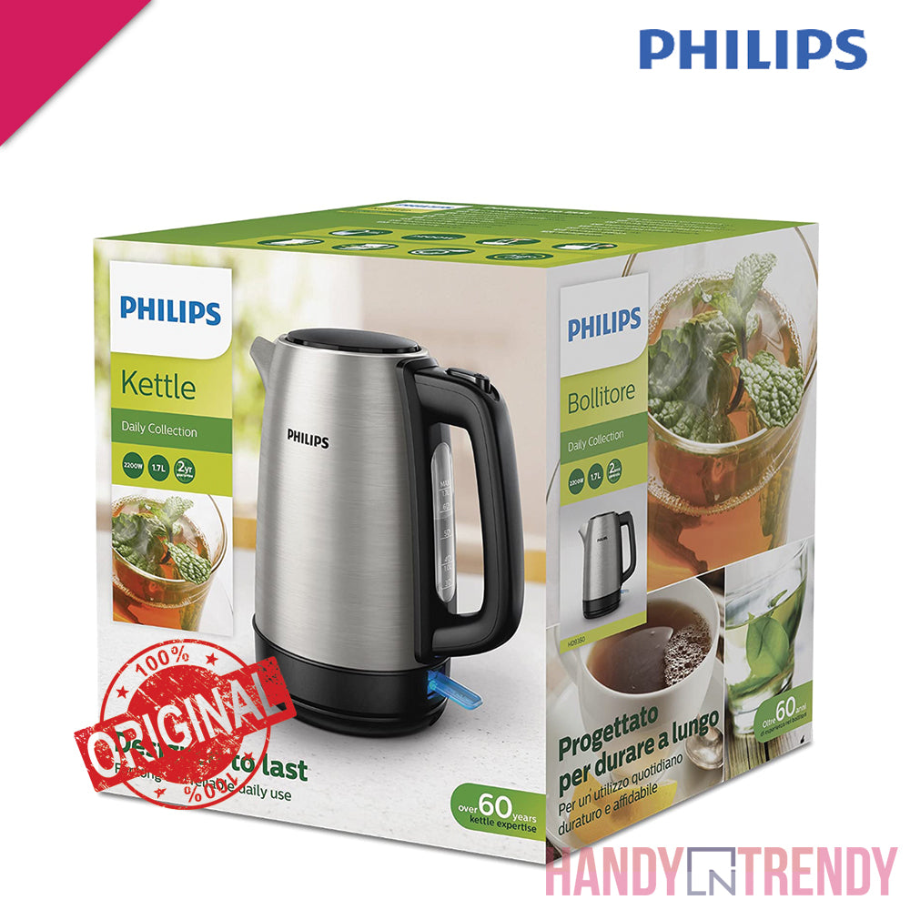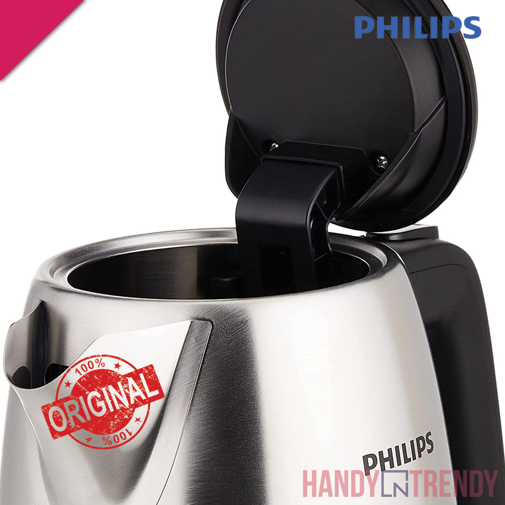 Philips Metal Kettle HD9350/92 is original Philips appliance. 1.7 liter capacity. Stainless steel body. Spring lid. Water level light indicator. 360 degree base.